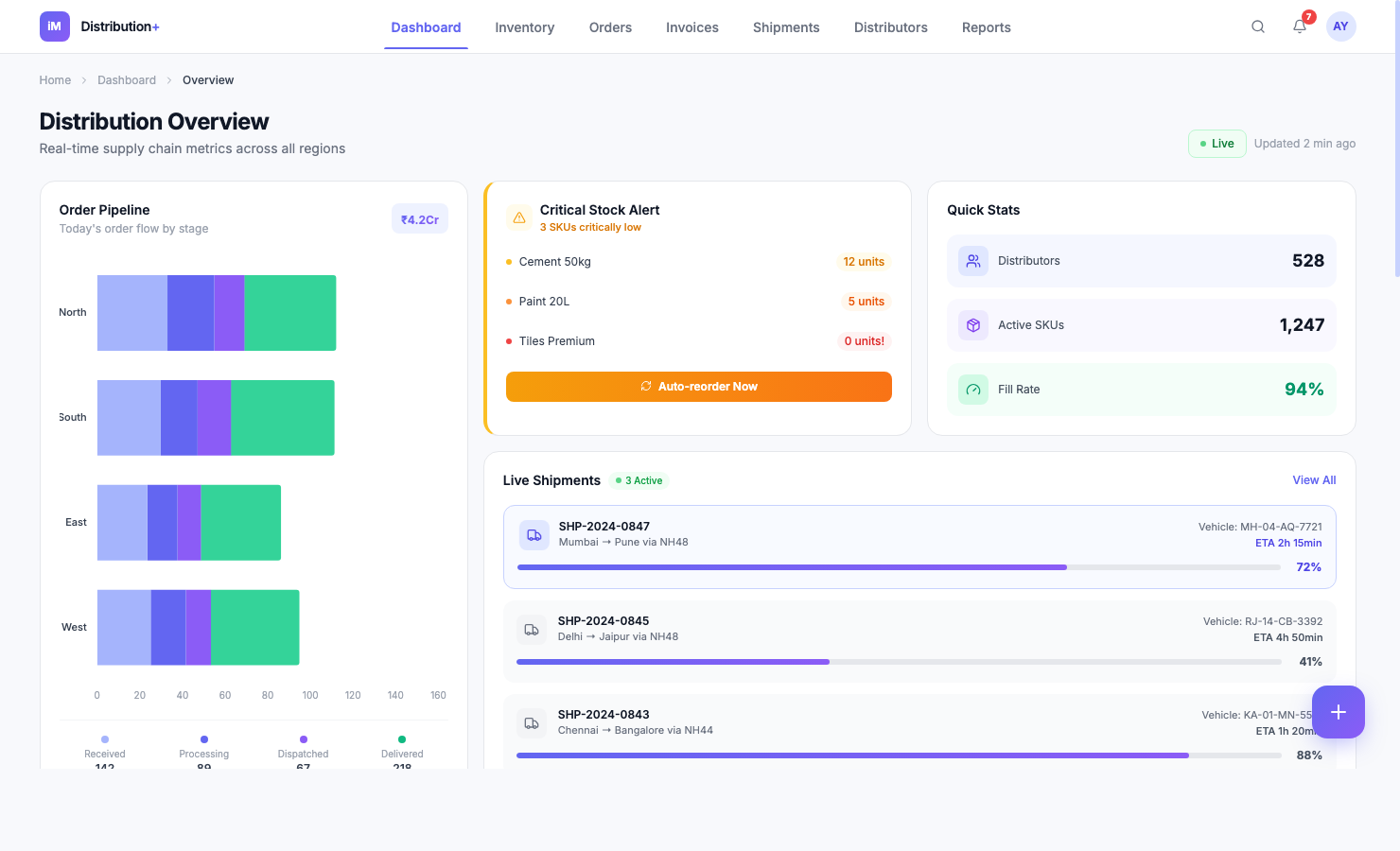 Real-time inventory across warehouses, automated purchase orders, GST-compliant invoicing, and last-mile shipment tracking.